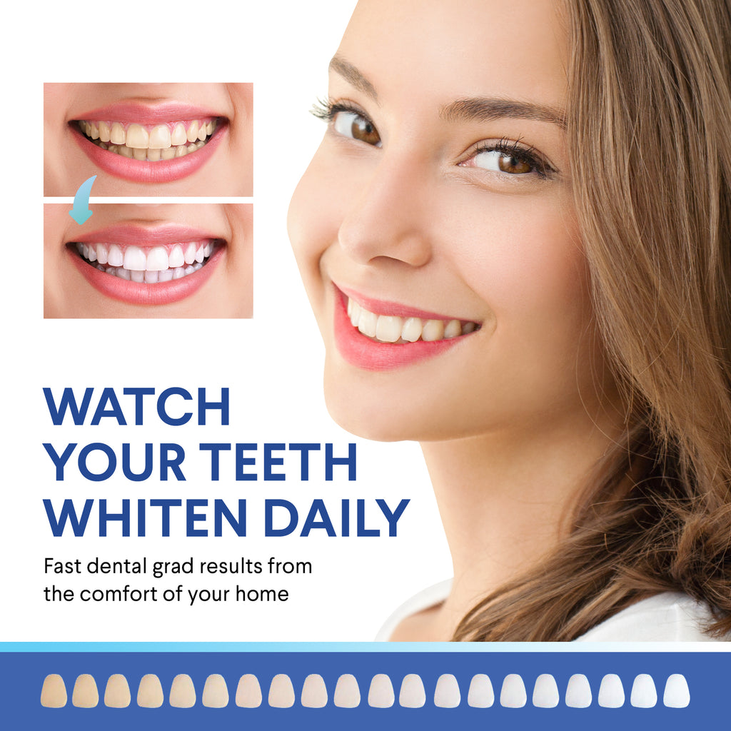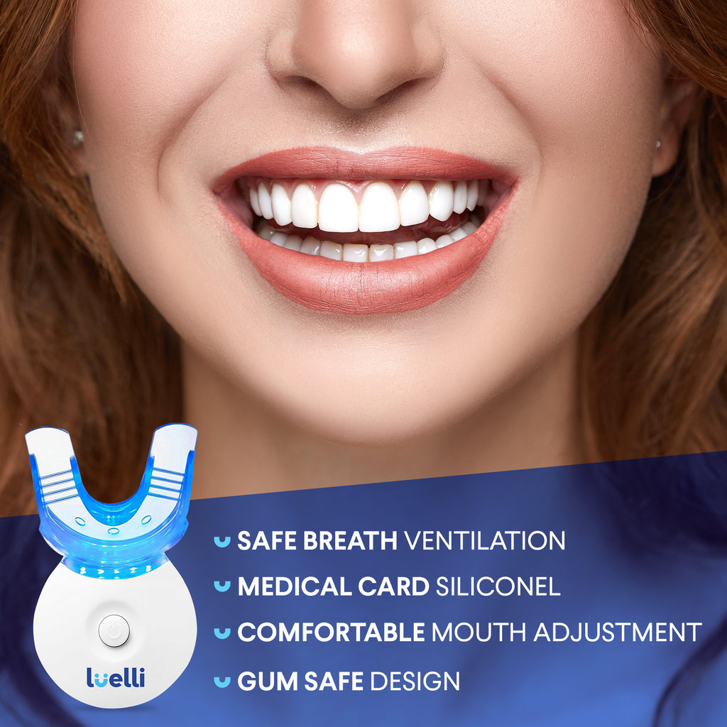 Teeth whitening treatment conducted at home. 35% carbamide peroxide teeth whitening gel and blue LED accelerator light give instant results. Easy and safe to use.